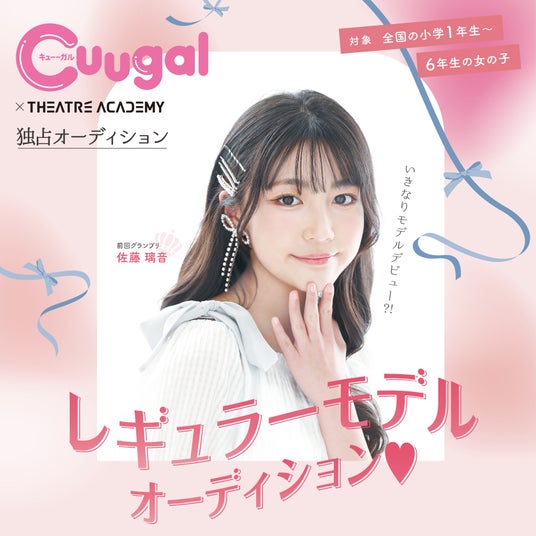 内田蓮・鎌田英怜奈・五藤希愛など多くのモデルをを輩出しているテアトルアカデミーが、女子小中学生向けエンタメファッション誌『Cuugal』とのコラボレーション企画として、「テアトルアカデミー × 『Cuugal』レギュラーモデルオーディション」を開催いたします。