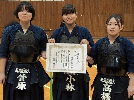 NSGグループの新潟医療福祉大学剣道部は、11月24日(日)に信州大学松本キャンパス(長野県松本市)で行われた「第62回北信越学生剣道新人大会」に出場しました。女子個人の部において菅原陽菜さん(理学療法学科1年)が準優勝、小林莉瑚さん(健康スポーツ学科1年)が3位に入賞しました。また女子団体でも3位入賞を果たしました。本大会は2年生以下の大会ですが、本学は1年生が台頭し、好成績を残すことができました。