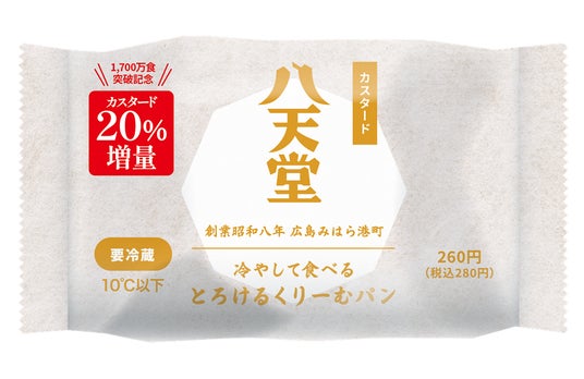 2022年10月から全国のファミリーマートで販売開始した八天堂の「冷やして食べるとろけるくりーむパン」シリーズは、累計販売数が1,700万個(2022年10月~2024年8月のファミリーマート店頭販売データより)に達しました。12月3日よりお客様への感謝をこめて、価格はそのままにカスタードクリームをたっぷりお楽しみいただける「冷やして食べる とろけるくりーむパン カスタード」のクリーム20%増量バージョンも数量限定販売中です。