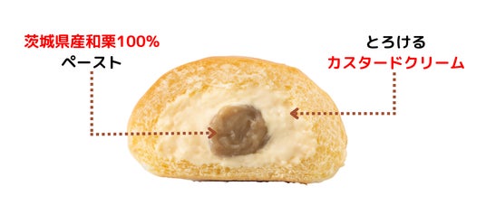 栗の一大産地である茨城県産の和栗を蒸し栗にしたマロンペーストと、とろけるカスタードクリームをベースにしたマロン風味のクリームをダブル充填しています。栗の風味が楽しめる季節限定フレーバーです。