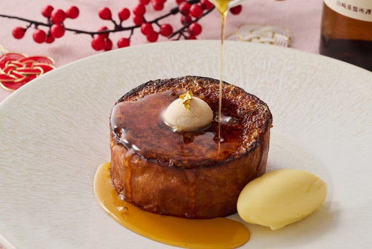 ブリオッシュパンにアパレイユを染み込ませしっとりと焼き上げた後、パリッと表面をキャラメリゼ。ウイスキー香る有塩バターを添え、仕上げにジャパニーズウイスキー「山崎」をシュッと一振りさせる。 バニラビーンズが入った濃厚なバニラアイスと共に頂く新春にぴったりなデザートです。 ランチコースにデザート(1,600円)としてプラスすることも可能です。