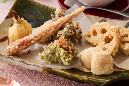 新年を寿ぎ、おめでたい食材を使用した祝い肴3種をご用意しました。活車海老で始まり、旬魚の白魚や白子、生うにの大葉巻き、旬菜は甘みの増す京人参や蓮根などの根菜類、〆にはかき揚げで天丼、天茶、天ばらからお選びいただけます。冬の味覚と春の訪れをお楽しみいただける贅沢なコースです。