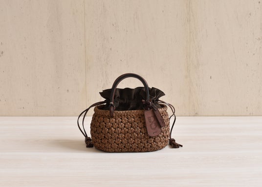 そんな手仕事をより美しく引き立てるのが、パーツたちです。国産の牛革をていねいに重ね合わせ、縫製し、磨きをかける、積層(せきそう)という技法を使用し、確かな革の証が分かる仕様にしています。巾着の紐部分にも同様に職人が一つひとつ革を積層して作ったパーツをあしらい、取り外しできる巾着本体は手触りの良い国産。上質なピッグスエードを使用しました。
