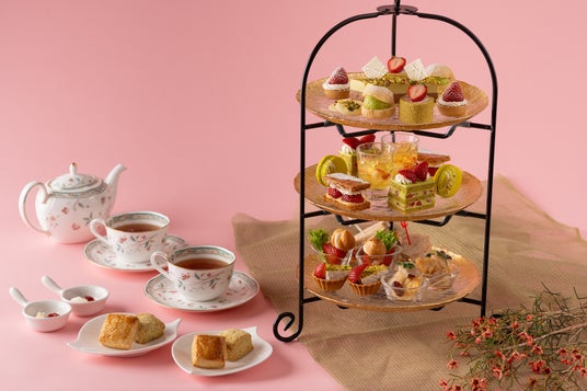 苺とピスタチオの春カラーが可愛いアフタヌーンティーで午後のひと時を。