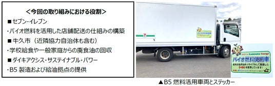 株式会社ダイキアクシス(本社:愛媛県松山市、代表取締役社長:大亀 裕貴、以下「ダイキアクシス」)の100%子会社である株式会社ダイキアクシス・サステイナブル・パワー(本社:東京都中央区、代表取締役:堀淵 昭洋、以下「DASP」)は、茨城県牛久エリアにおいて、株式会社セブン-イレブン・ジャパン(本社:東京都千代田区、代表取締役社長:永松 文彦、以下「セブン-イレブン」)店舗への配送車両(一部)に対し、バイオ燃料の供給を開始いたします。