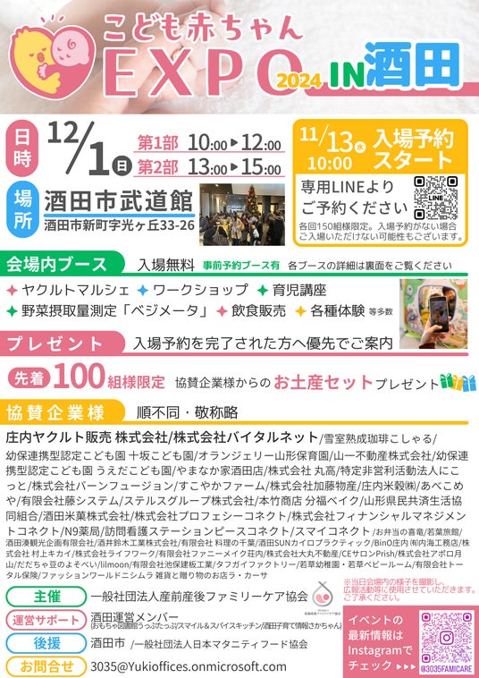 子育てファミリーに楽しみや正しい情報、繋がりを提供することを目的として、2023年3月より非営利で開催しているこども赤ちゃんEXPOは、これまでに宮城県、秋田県、山形県、静岡県、茨城県で開催し、今回で8回目の開催となりました。山形県酒田市での開催のきっかけとなったのは、2023年8月に酒田に住むママさんから届いた1通のメッセージでした。「酒田には何もない、子育てしにくい地域、という印象を払拭したい」との想いを受けて2023年12月に酒田市で初開催し、来場者や出展者より「また開催してほしい」と多くの声をいただいたことから、2024年6月より再開催に向けて企画がスタート。今回は酒田市と一般社団法人日本マタニティフード協会からの後援、地元を中心とする45社の企業からの協賛、37団体のブース出展により開催が実現しました。