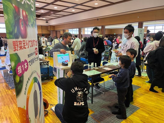 今回はベビーマッサージや手形アートなど過去回でも人気のブースに加え、フェイスペイントやヘアケア体験サロンなどが初出展。頬のクリスマスペイントやカットしてもらった前髪で記念撮影をする親子の姿が多く見られました。昨年大人気だったこどもDJブースでは、酒田市のマスコットキャラクター「もしぇのん」と庄内ヤクルト販売株式会社の「ヤクルトマン」が子どもたちと一緒に音楽に合わせて体を動かし、盛り上がりを見せていました。企業ブースでは、ヤクルトの詰め放題には行列ができ、野菜摂取量を測定する「ベジメータ」では日頃の食生活を見直すきっかけとなりました。
