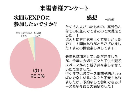 イベント終了後の来場者アンケートでは、「雰囲気もよくて楽しかったです」「気になっていたものを無料で体験する事ができ、とても素晴らしいイベントだと思いました」「最後まで飽きることなく時間が足りない!と思うくらいあっという間でした」など好評の声が多くありました。過去開催でも満足度は毎回90%を超えておりますが、今回は過去最高の95%を超える数字となり、「また開催してほしい」「年2回開催してほしい」といった要望も聞かれました。