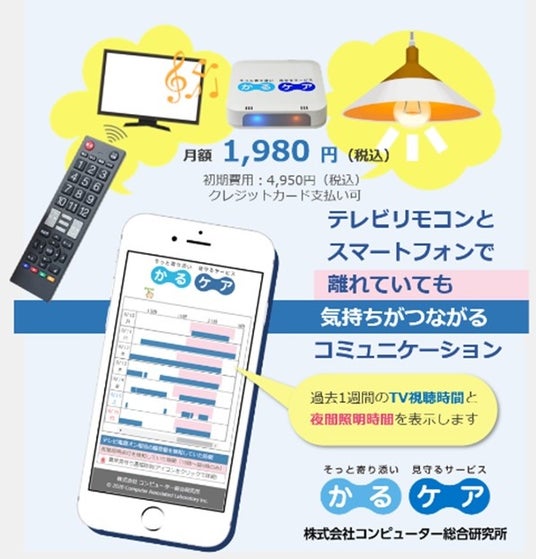 見守りサービス「かるケア」は、月額1,980円(税込)で手軽に始められ、高齢者宅のテレビの横に置いた小型の専用機器でテレビ視聴や部屋の照明点消灯などの生活リズムを見守ります。異常を検知して家族に通知する見守り機能はもちろん、“離れていても家族の気持ちがつながる新しいコミュニケーション方法“を提案しています。