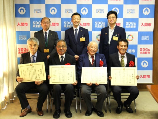 表彰式(令和6年11月19日撮影)上段左から副市長、市長、環境経済部長/下段左から出川 義雄 氏、森田 清 氏、舘川 正一 氏、松田 秀幸氏(室岡 誠 氏は都合により欠席)