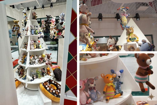 全国から寄贈されたハッピートイズの2024年キャラクター「つぶらな瞳のこじかちゃん」たちが、吹き抜け広場「ガタリウム」のこじかちゃんのお部屋に展示されました。世界中の子どもたちの笑顔を思い浮かべながら、ひとつひとつ丁寧に手づくりされたこじかちゃんたちが、来場者のみなさまをお迎えします。展示期間中は、1F WESTSIDE「プレミィ・コロミィ」にて、ハッピートイズプロジェクトに参加できるパッチワークの型紙と編みぐるみの参加セットを期間限定で販売中。この機会に、ぬいぐるみ作りに挑戦してみませんか?これらの展示は、大阪・梅田の冬の風物詩である、阪急うめだ本店のコンコースウインドーのクリスマスディスプレイを長年にわたって手がけているアートディレクター、亀山和廣氏のデザイン・監修によるものです。温かみのある空間で、こじかちゃんたちとの素敵な出会いを体験してください。
