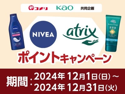 コメリ・花王 共同企画「ニベア・アトリックス ポイントキャンペーン」条件・賞品:期間中、コメリのアプリからエントリーし、対象商品を同日に税込1,000円以上お買い上げごとに、もれなく200ポイントプレゼント