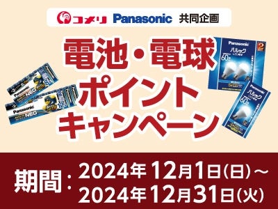 コメリ・パナソニック 共同企画「電池・電球ポイントキャンペーン」条件:期間中、対象商品を同日同店舗でお買い上げ税込1,000円を1口として抽選でポイントプレゼント。