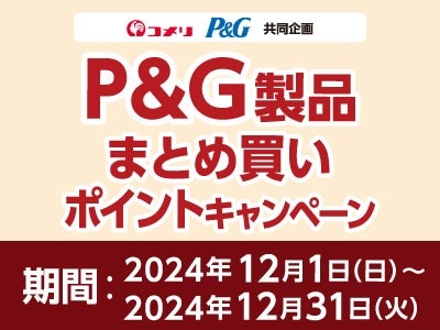 コメリ・P&G 共同企画「P&G製品まとめ買いポイントキャンペーン」条件:期間中、対象のP&G商品を同日同店舗でお買い上げ税込2,000円を1口として、抽選でポイントプレゼント。