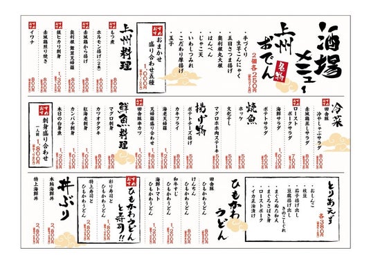 名物は、上州牛筋煮込み紐皮うどん、吾妻田舎豚と有機野菜のしゃぶしゃぶさらだ、下仁田生芋蒟蒻,丸大根入おでん盛り合わせです