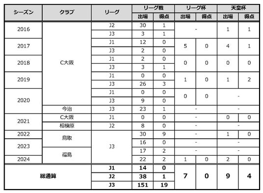 サッカー歴:三和スポーツ少年団→桜FC→飛龍高→大阪体育大→セレッソ大阪→FC今治→セレッソ大阪→SC相模原→セレッソ大阪→ガイナーレ鳥取→セレッソ大阪→福島ユナイテッドFC