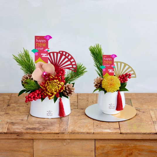 はじまりの白、よろこびの紅。明るい兆しを感じさせる黄金色も加わって、ますます慶賀な色合わせの「SHINKA 新花」。末広がりの扇がめでたい風を起こします。アレンジメントは白い陶器に、邪気を払う幸福の象徴と言われる房結び(タッセル)をあしらい、縁起の良いアクセントを入れています。