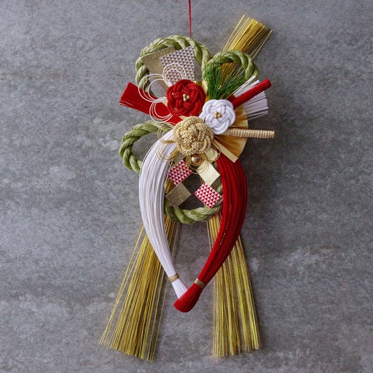 不浄を断つ印のしめ飾りに、黄金色の扇を合わせました。紅・白・金の色使いがお正月らしさ満点です。