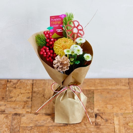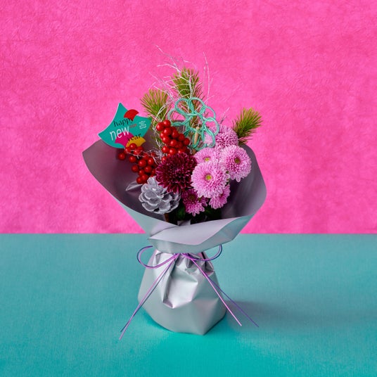 2025年にちなんで、税抜2,025円(税込2,228円)の新春特別価格でご用意いたします。年の初めに初春の花を飾り、福を呼び込めるようにとご用意したこの時期だけのブーケです。