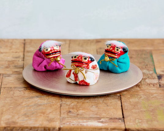縁起の良いのお正月小物。小さな巳の干支飾りは、おみくじが入った楽しい仕掛けが。青山フラワーマーケットオリジナルデザインで、おみくじの中身もオリジナルです。幸せを招き邪気を払ってくれるといわれている獅子舞は、梅柄と今年のテーマカラーのちりめんの着物を羽織って登場。12月より全国の店舗にて順次販売しております。