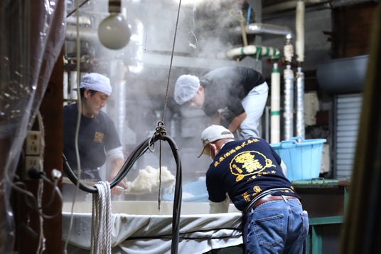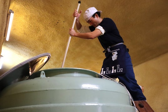 発酵する醪を混ぜる「櫂入れ」のワンシーン