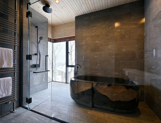 バスルームには、宮城県産の希少な伊達冠石を贅沢に使用した浴槽を設置。重厚で美しい石肌が生み出す特別な空間で、羊蹄山の雄大な景色を眺めながら贅沢なひとときをお楽しみいただけます。