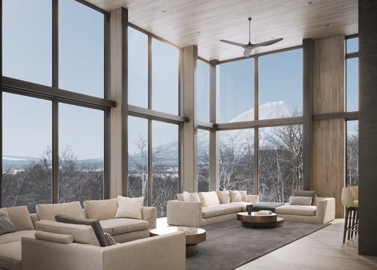 リビングルームの天井高は、約5メートル。開放感あふれる窓の外には絵画のように美しい羊蹄山が広がります。