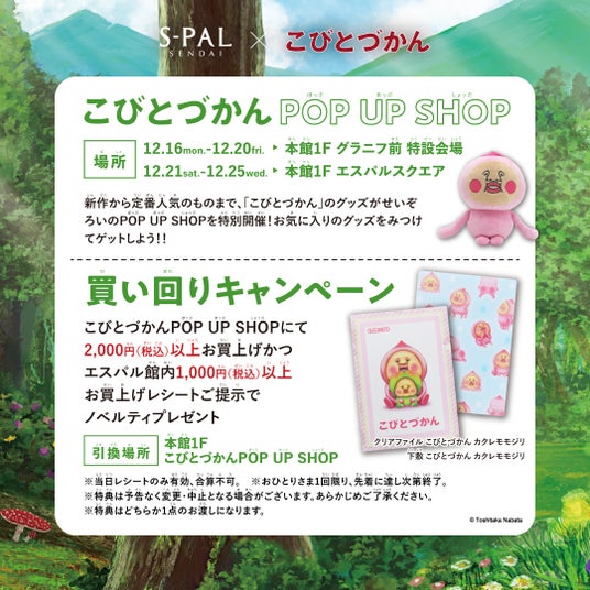 仙台ターミナルビル株式会社(本社:仙台市、代表取締役社長:松崎哲士郎)が運営するエスパル仙台(所在地:仙台市青葉区中央1-1-1)は、12月16日(月)~12月25日(水)の期間中、こびとづかんとのコラボレーションキャンペーンを初開催いたします。「こびとづかん」は、主人公の「ぼく」が見つけた、昆虫でも植物でもないインパクトのあるビジュアルの不思議な生き物「コビト」が描かれている絵本 『こびとづかん』からはじまった児童書シリーズ。2006年出版以降シリーズの累計発行部数は310万部を突破し、数世代にわたって愛されています。期間限定のPOP UP SHOPでは、「こびとづかん」の書籍や新作から定番人気のグッズなど約140種以上がそろうほか、参加者各日先着でオリジナルステッカーをプレゼントする「コビトをさがせ!」館内回遊イベントを実施します。