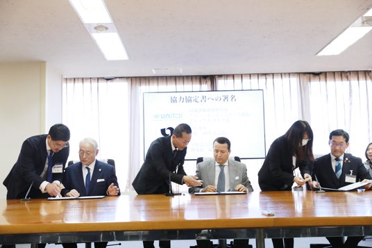 開設の締結式はいわき市役所で行われ、アレックス・メヒア国連ユニタール・グローバル・ネットワーク部長、緑川浩司昌平黌理事長、内田広之いわき市長が「協力協定書」に署名し、国連旗も贈呈されました。