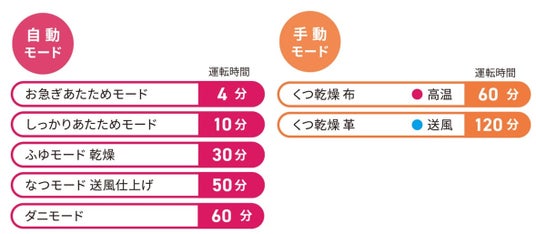 自動モードは夏・冬の乾燥モード、ダニモードだけでなく、あたためモードを搭載しているため、1年を通して使用できます。また、手動モードでは温度を3段階(高温風・低温風・送風)、時間を7段階(5・10・30・60・90・120・180分)調整できるため、自分の好みの暖かさやベッドの大きさなど使用シーンに合わせて調整できます。