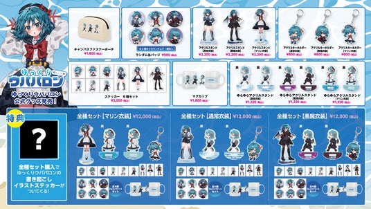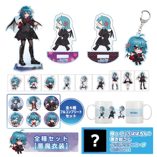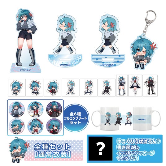 アクリルスタンド、アクリルキーホルダー、マグカップ、ステッカー9種セット、ランダム缶バッジ6種コンプリートセット、ゆらゆらアクリルスタンドがセットになっています!