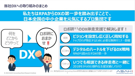 株式会社ASAHI Accounting Robot研究所は、ヒトとロボット協働時代を推進、RPAで日本の中小企業を変える!」を合言葉に山形、仙台、東京、名古屋を拠点に北海道から沖縄まで全国各地の会計事務所、社労士事務所、事業会社にRPAやローコード開発ツール、AIを活用したDXソリューションの開発及び導入支援を行っております。前身は1年間で数千時間にも及ぶ効率化に成功した税理士法人あさひ会計の業務効率化推進チームで2019年1月に法人化しております。