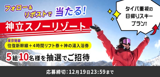 東武トップツアーズ株式会社(本社:東京都墨田区、代表取締役社長:百木田康二)は、神立スノーリゾートの新プラン発売を記念して、当社公式Xにて抽選で5組10名様に、新プランの目玉商品「往復新幹線+4時間リフト券+神の湯入浴券」がセットになった、日帰りスキープランにご招待するキャンペーンを実施しますので、お知らせいたします。