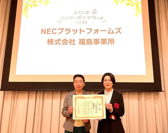 NECプラットフォームズ福島事業所は、福島県内において地球温暖化対策に率先して取り組む事業所を表彰する制度の「ふくしまゼロカーボンアワード2024」で、産業部門の最優秀賞を受賞しました。12月9日にホテル福島グリーンパレスで開催された授賞式にて、福島県より表彰されました。