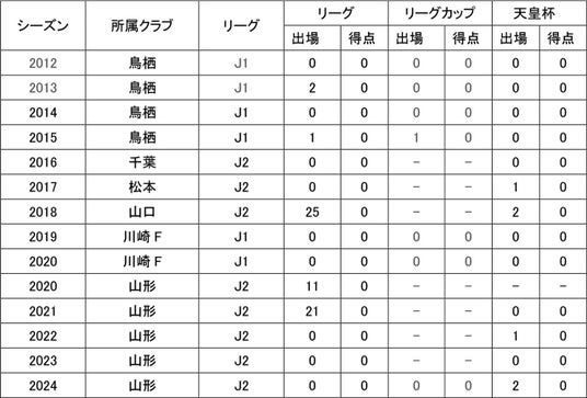所属歴/フォルテFC熊本ジュニア - フォルテFC熊本 - 大津高校 - 福岡大学 - サガン鳥栖 - ジェフユナイテッド市原・千葉 - 松本山雅FC - レノファ山口FC - 川崎フロンターレ - モンテディオ山形