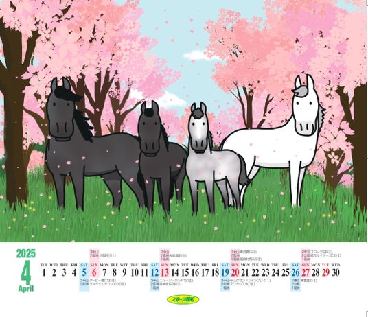 「スポーツ報知」を発行する報知新聞社(代表取締役社長・依田裕彦)は、全国の競馬ファンを魅了する馬のイラストレーター・おがわじゅりさんが描いた、実在馬と架空馬を組み合わせたイラストカレンダーを12月11日(水)から販売します。色彩も鮮やかで、季節にマッチした可愛らしい表情や、躍動感あふれる競走馬や架空馬が卓上判に収まっています。さらに2025年のJRA開催日程(レーシングカレンダー)がイラスト面、カレンダー面の両方に掲載されている実用性抜群なカレンダーとなっています。