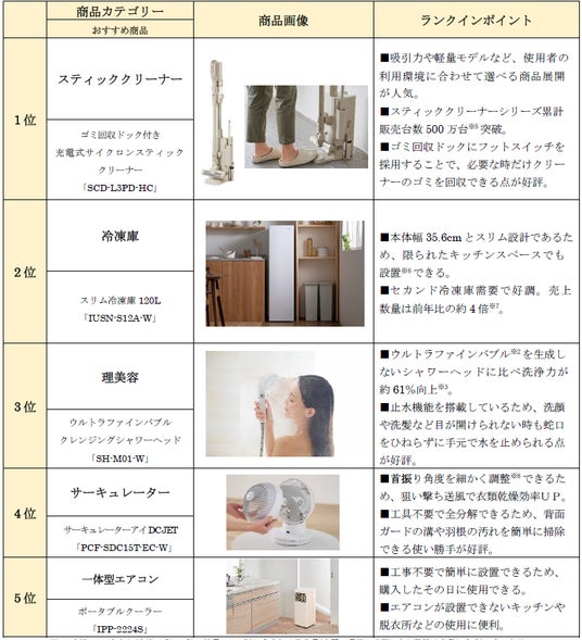 家電部門ではユーザーニーズに当社のアイデアを結びつけた「なるほど商品」が上位に入っています。吸引力の強さや取り回しやすさなど、使用者の利用環境に合わせて選べる商品展開が評価を得たスティッククリーナーが第1位に、限られたスペースでも多くの食品を保存できるスリムタイプの冷凍庫が第2位になりました。理美容カテゴリーとしては、ウルトラファインバブル(※2)により高い洗浄力(※3)を実現し、最大約50%の節水(※4)ができるMiCOLA「ウルトラファインバブル クレンジングシャワーヘッド」が第3位になっています。