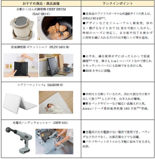 アイリスオーヤマ株式会社(本社:宮城県仙台市、代表取締役社長:大山 晃弘)は、2024年年間(※1)売上ランキングを発表しました。当ランキングは当社の家電・生活用品カテゴリーごとに売上や前年比伸び率を元に作成したもので、そのうち上位5位のカテゴリーのなかから代表アイテムを掲載しています。