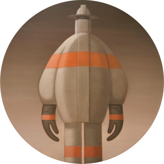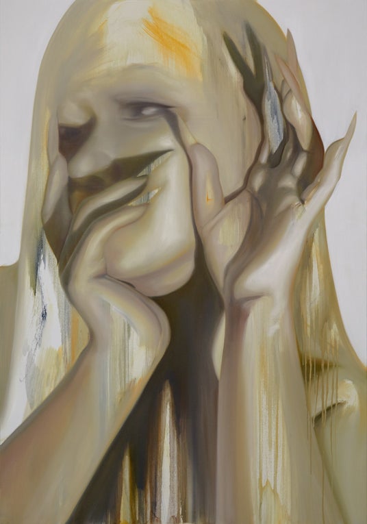 これまで人間の物質としての輪郭と現象としての状態の双方に注目し、そのあわいに蠢く不定形で非人間的な存在を描く。初期より一貫して人物をモチーフとし、そのスタイルは具象的な描画からランダムなストロークを用いた抽象的な描画へと変化している。白飛びのような情報を欠いた空白、身体の隙間にだらりと流れる液体、セルフィーやアーティスト写真を思わせるエゴイスティックな表情やポーズ。それらが画面全体へ溶け込むように描かれることで、「私」から「何か」への変異のプロセスそのものを捉え、これまでの人間像から脱しつつある未完の存在としてのわれわれの姿をあらわにしている。