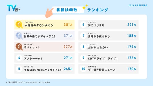 2024年1月1日から10月31日におけるTVerでの番組検索数(※2)は、TBSテレビ『水曜日のダウンタウン』(381万件)が最も多い結果となりました。また、上位10番組のうち、9番組がバラエティ番組となりました。