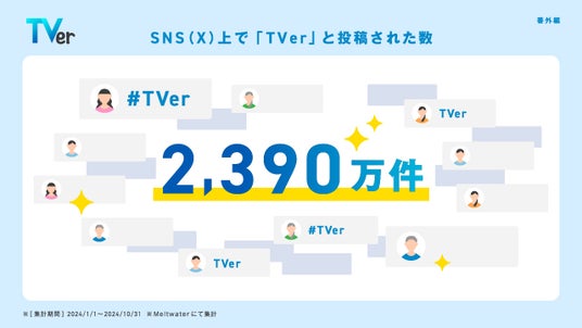 2024年1月1日から10月31日における、X上での「TVer」を含んだ投稿数(※8)は約2,390万件でした。ユーザーの皆さまや番組公式アカウント、出演者の方々などたくさんの方が番組の感想や配信情報を投稿していただいたことで、2,300万件を超える投稿数を記録しました。X上で「TVer」について投稿していただいたすべての皆さまに感謝申し上げます。2025年も引き続きTVerをご利用いただき、面白かった番組、シーンの感想を投稿してお楽しみください。