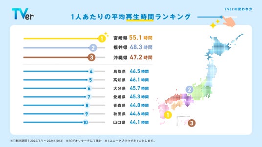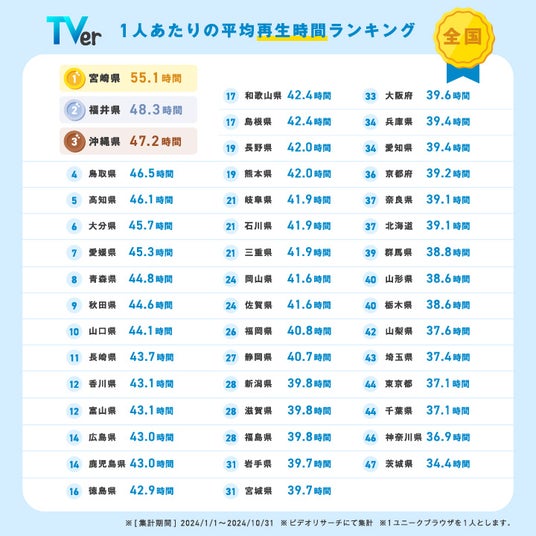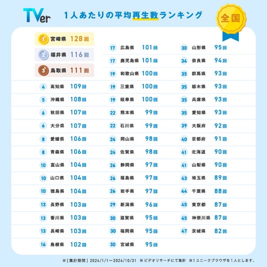 宮崎県や福井県など、クロスネット局のある県が平均再生数、平均再生時間ともに上位となる傾向がありました。居住地域の放送では見られない番組もTVerでお楽しみいただいている様子がうかがえます。