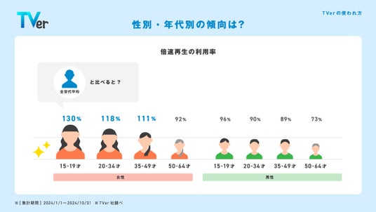 ※5:2024年1月1日~10月31日における、TVer単体の倍速再生使用率について全世代平均を100とした場合の性年代別の比較(TVer社調べ)