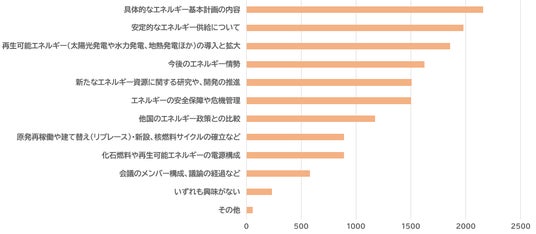 エネルギー基本計画に関する設問では、名称を「聞いたことがある」人は48%と半数近くいたものの、見直し内容を「知っている」人は7%にとどまりました。「エネルギーについて知りたい内容やテーマ」(複数回答)で「具体的なエネルギー基本計画の内容」と回答した人は、過半数の53%におよび「知りたいけど知らない」現状が浮き彫りとなりました。