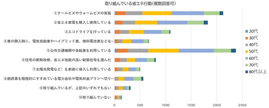 具体的には「公共交通機関や自転車を利用している」(58%)が最も多く、全年代で1位となりました。2位の「クールビズやウォームビズの実施」(52%)までが半数を超えました。続いて「省エネ家電を購入し使用している」(45%)、「エコドライブを行っている」(27%)となり、多くの人がエネルギーの無駄遣いを避ける傾向がみえました。