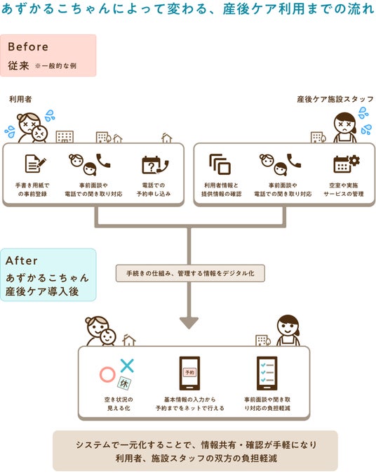 わたしたちは、あずかるこちゃん産後ケアを単に導入するのではなく、各現場の動きや流れも理解した上で最適な形で仕組み作りをすることが重要だと考えます。これらのリサーチを受け、システムで解決することと、各現場での対応方法を適切なものに変えることという2方向での対応を具体的に検討しました。