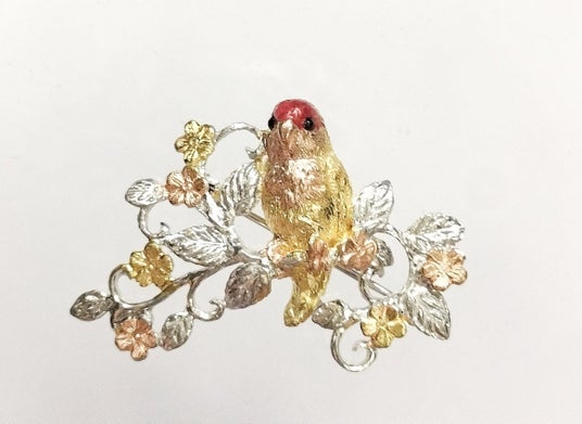 コザクラインコをシルバーで作りました。イエローゴールドやピンクゴールドでコーティングを施し、華やかに仕上げました。