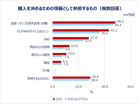 自分へのクリスマスプレゼントや初売りで購入予定のものとして上位にランクインした、コスメやファッションアイテムを購入する際は、使い心地や使用イメージも気になります。クリスマス~年末年始に限らず、コスメ・ファッションアイテムの購入を決める際に何を参考にしているのか聞いたところ、約7割は何かしら参照してから購入を決めていることがわかりました。