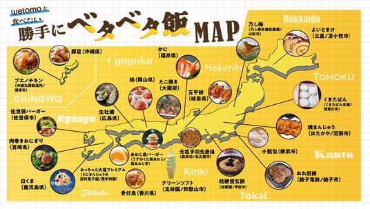 「wetomoと食べたい 勝手にベタベタ飯MAP」は、全国各地の逸品をお取り寄せできる「47CLUB」とコラボして作成いたしました。wetomoが勝手におすすめする「ベタベタ飯」を記しています。wetomoとともに、ベタベタしたグルメをこの機会にぜひご体験ください。