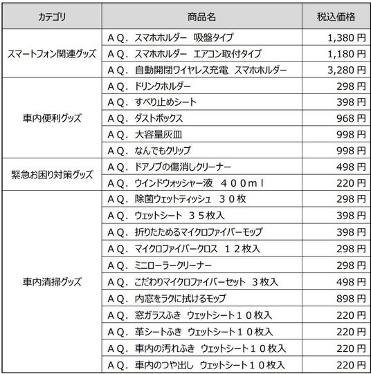 取り扱いアイテムは「AQ.」から、オートバックス店舗でも取りそろえる人気商品を中心に、コンビニサイズにリサイズしたウインドウォッシャー液や、スマホ関連や車内清掃グッズ、ゴミ箱、ウェットシートなど、お客様が購入後すぐに使えるカー用品21アイテムを取りそろえています。